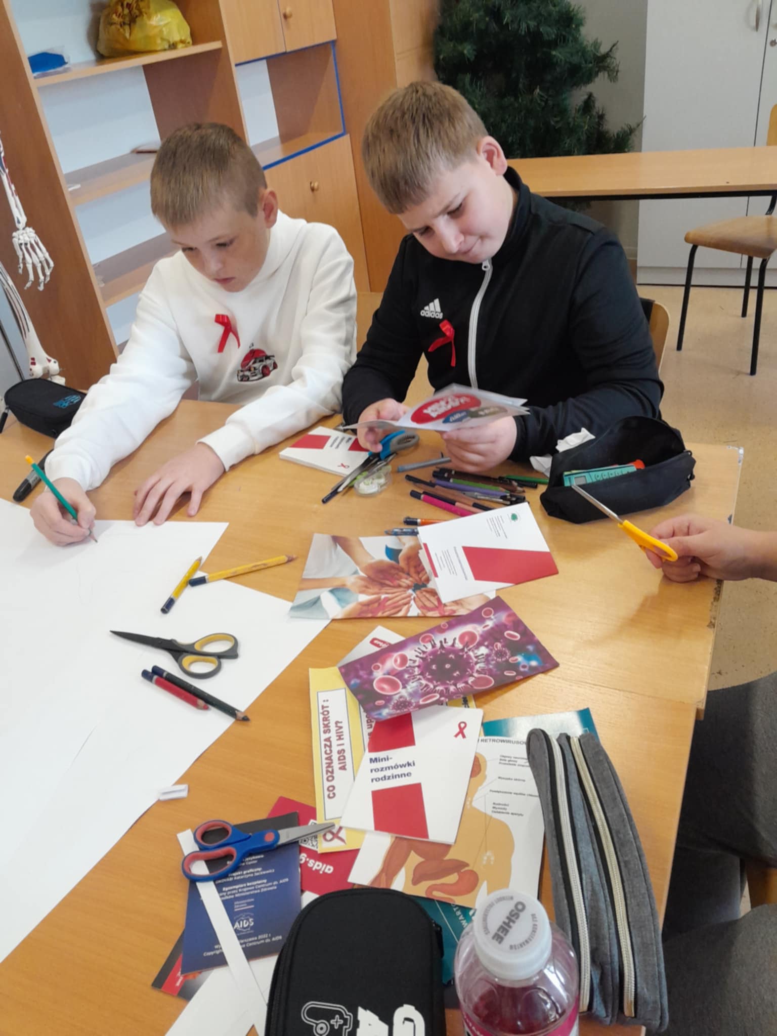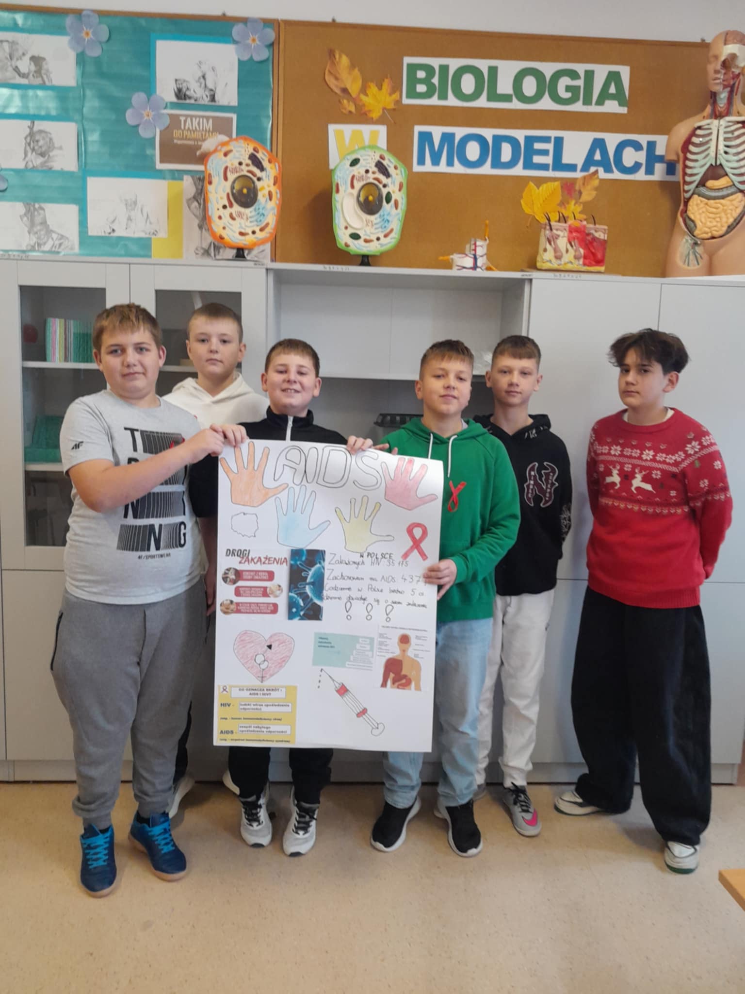 Dodatkowo, w ramach obchodów Światowego Dnia AIDS, uczniowie klas VII i VIII podczas lekcji biologii przygotowali plakaty edukacyjne, prezentujące: