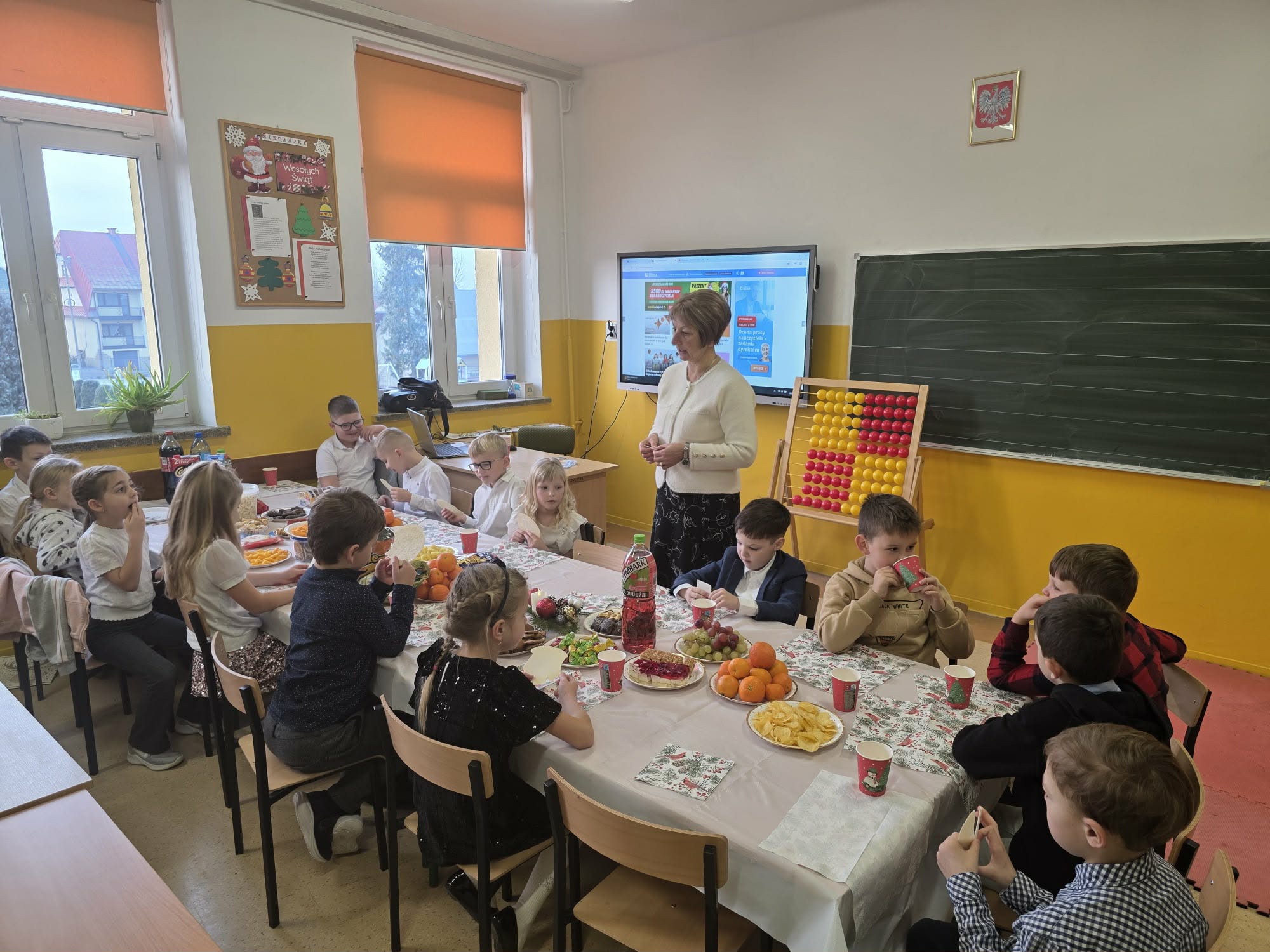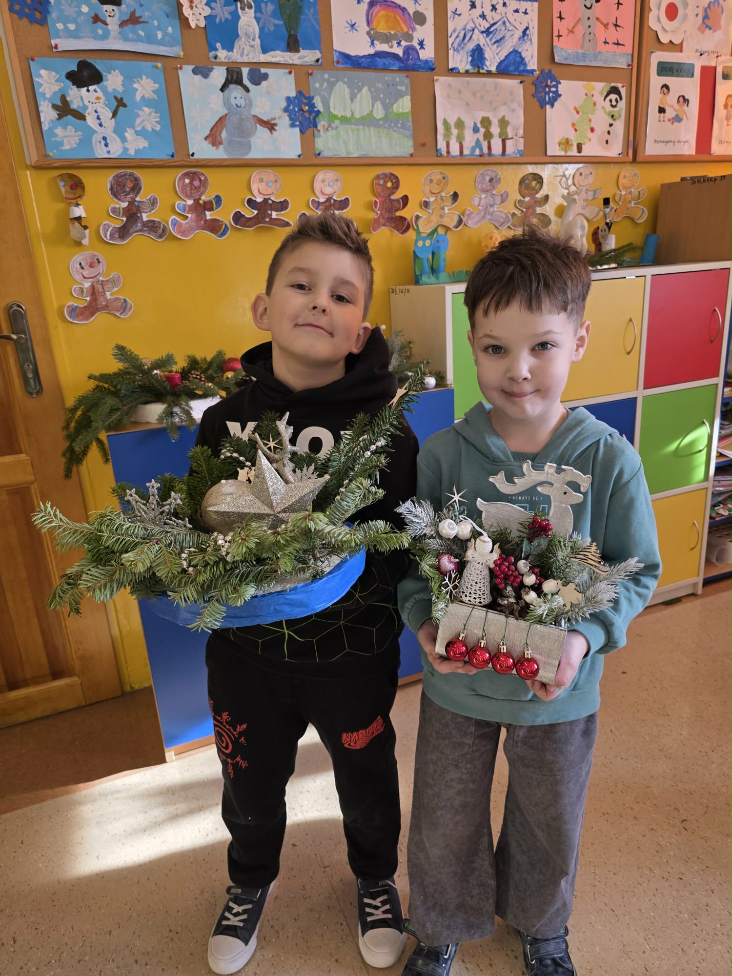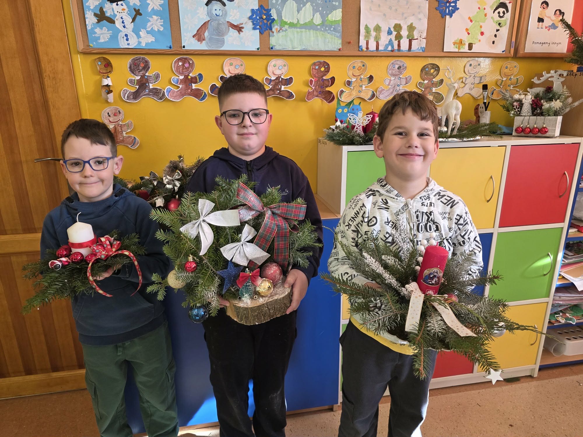 Wklasie pierwszej zrobiło się wyjątkowo twórczo i świątecznie! Uczniowie z ogromnym zapałem przygotowywali własnoręczne stroiki bożonarodzeniowe oraz piękne kartki świąteczne, pełne kolorów, brokatu i dziecięcej wyobraźni. Każda praca była niepowtarzalna i wykonana z wielkim sercem.Twórczym działaniom towarzyszył radosny, świąteczny nastrój, który dopełniła klasowa wigilia. Było wspólne łamanie się opłatkiem, serdeczne życzenia oraz degustacja tradycyjnego barszczyku z uszkami.