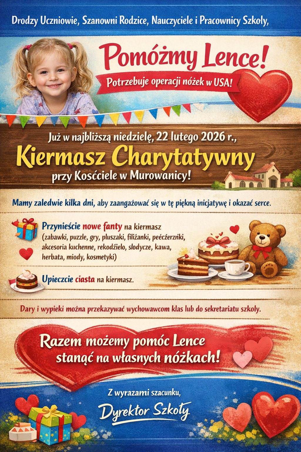 Już w najbliższą niedzielę, 22 lutego 2026 r., obok Kościoła w Murowanicy odbędzie się kiermasz charytatywny, z którego całkowity dochód zostanie przeznaczony na leczenie Lenki.