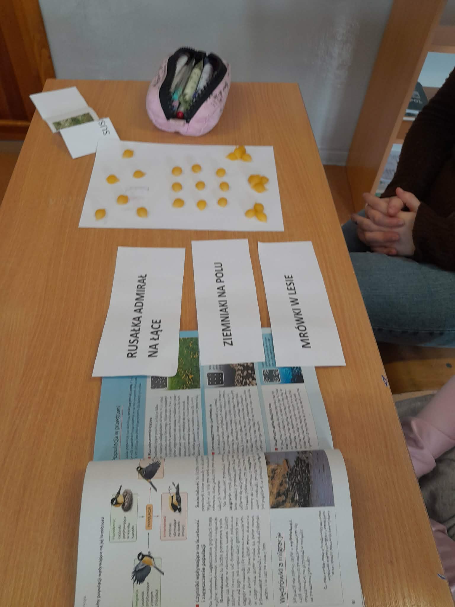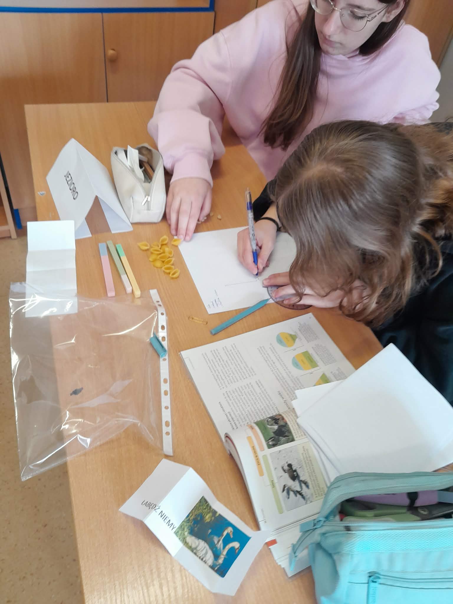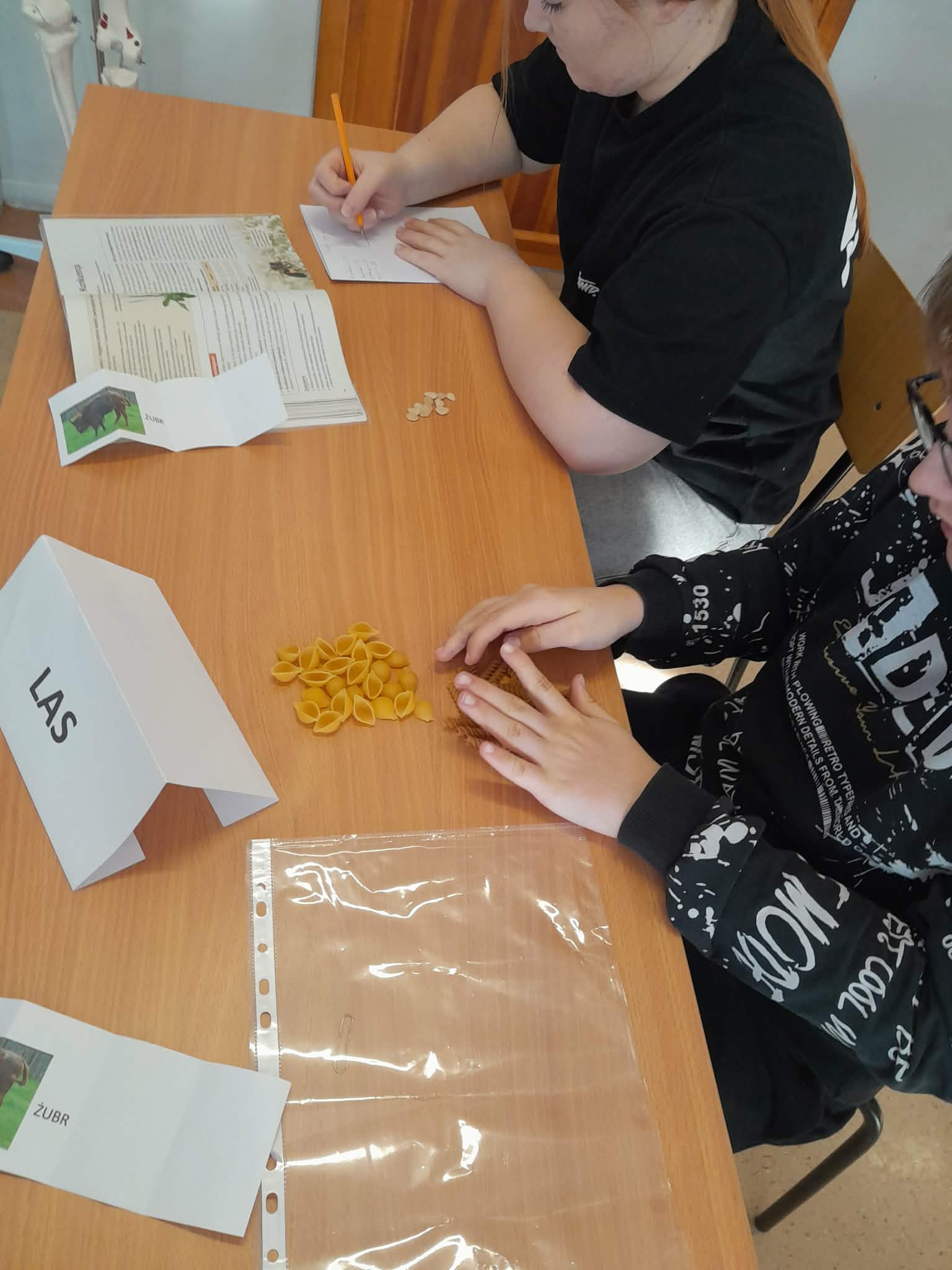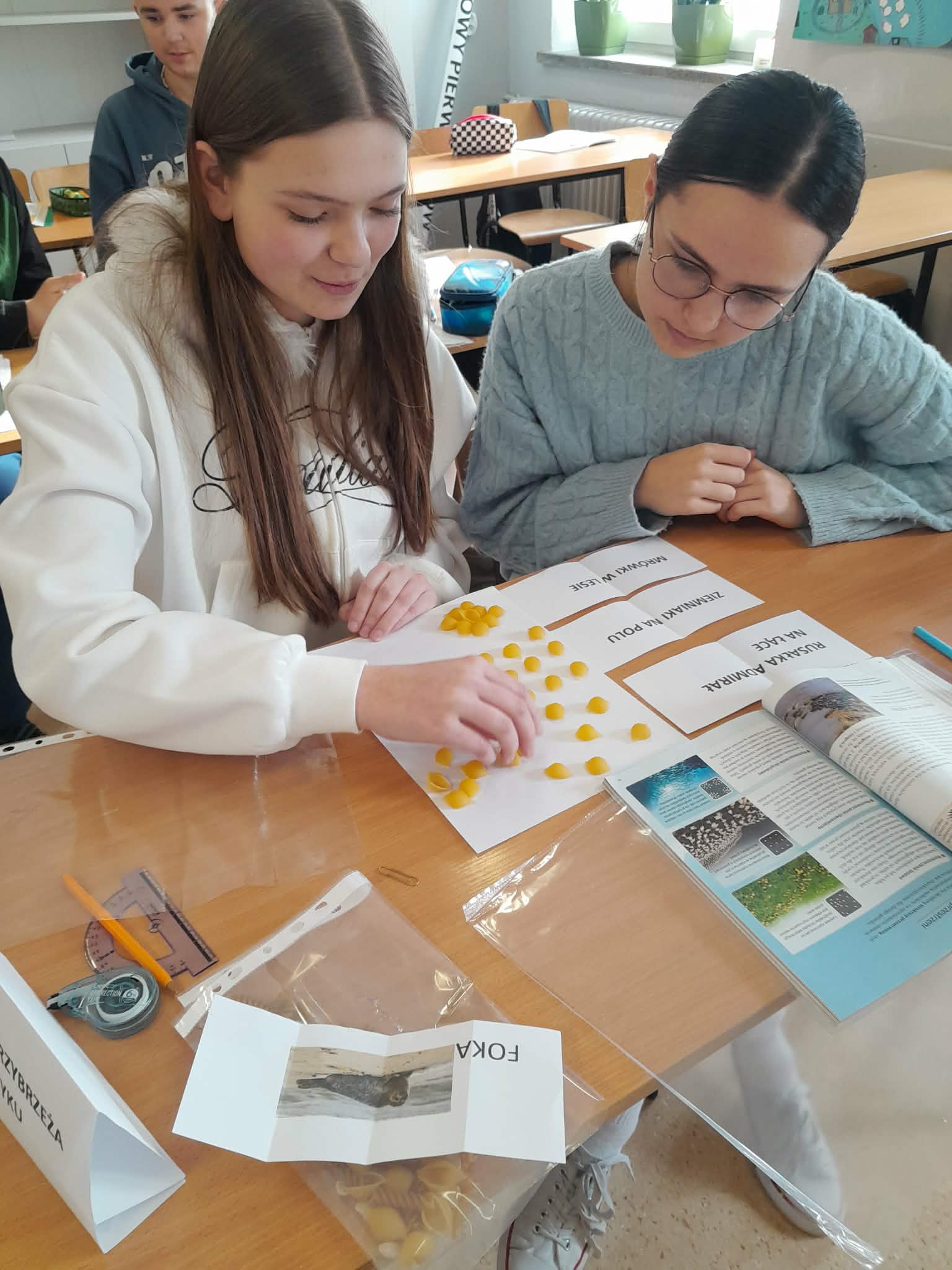 Podczas lekcji uczniowie losowali swój gatunek, dopasowywali go do ekosystemu i analizowali populację – liczebność, rozmieszczenie, strukturę wiekową i płciową. Do pracy użyli makaroników jako modeli organizmów – świetny sposób, by w praktyce zobaczyć abstrakcyjne pojęcia ekologiczne! Nauka przez działanie naprawdę działa!