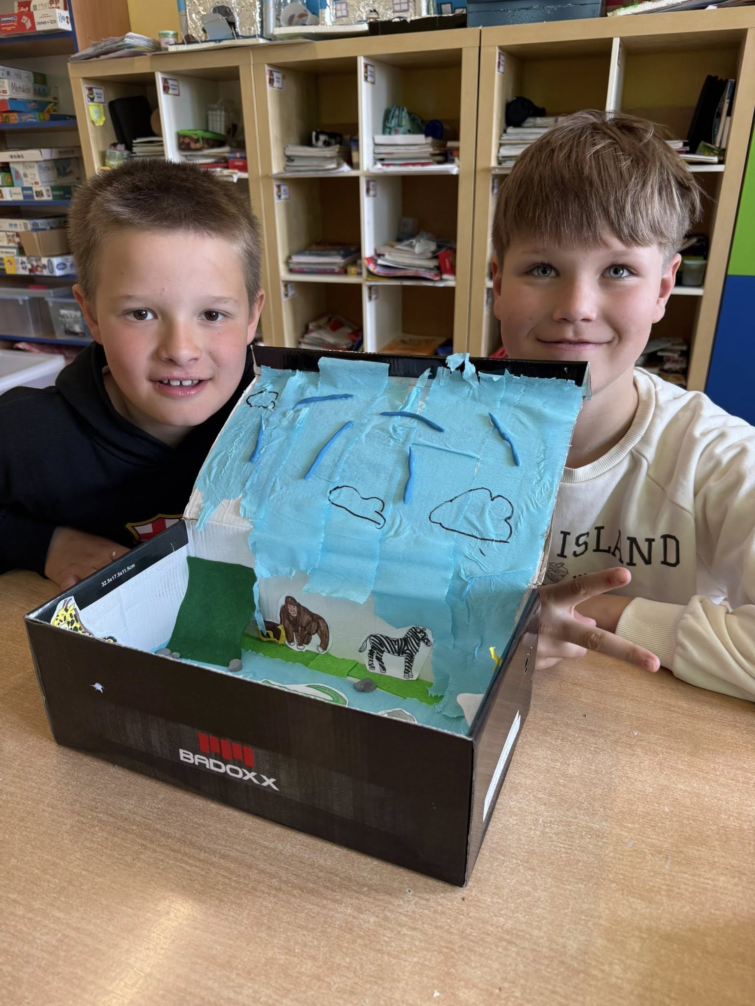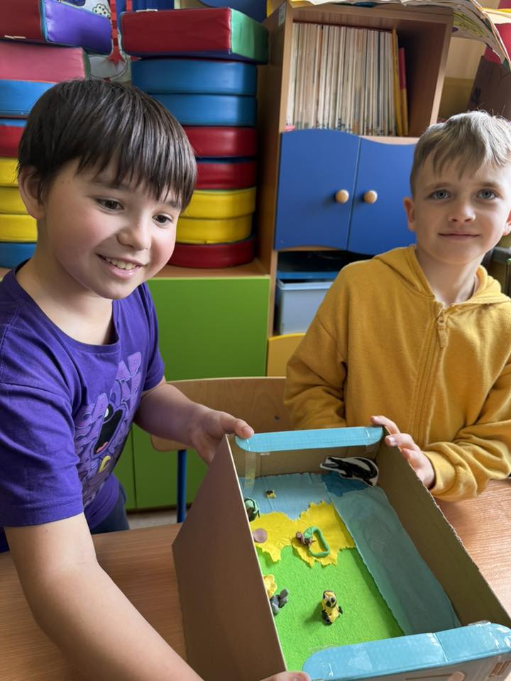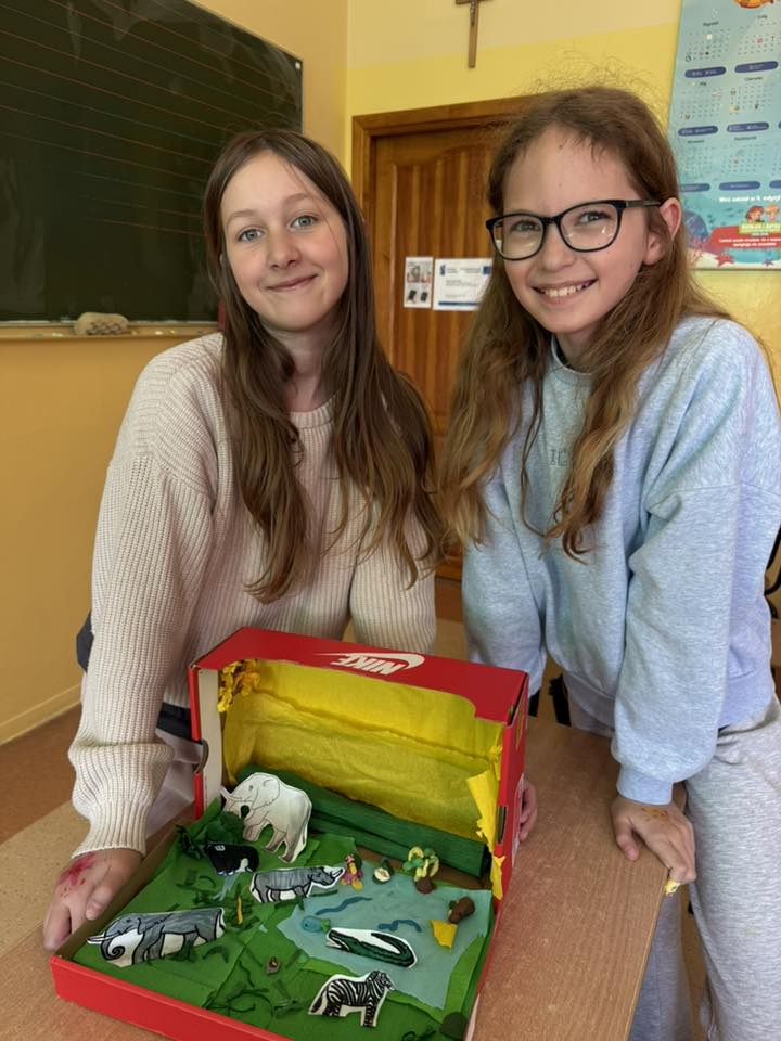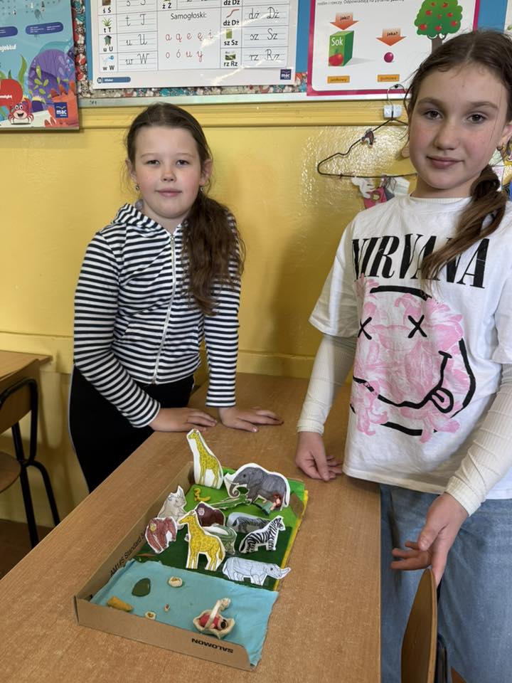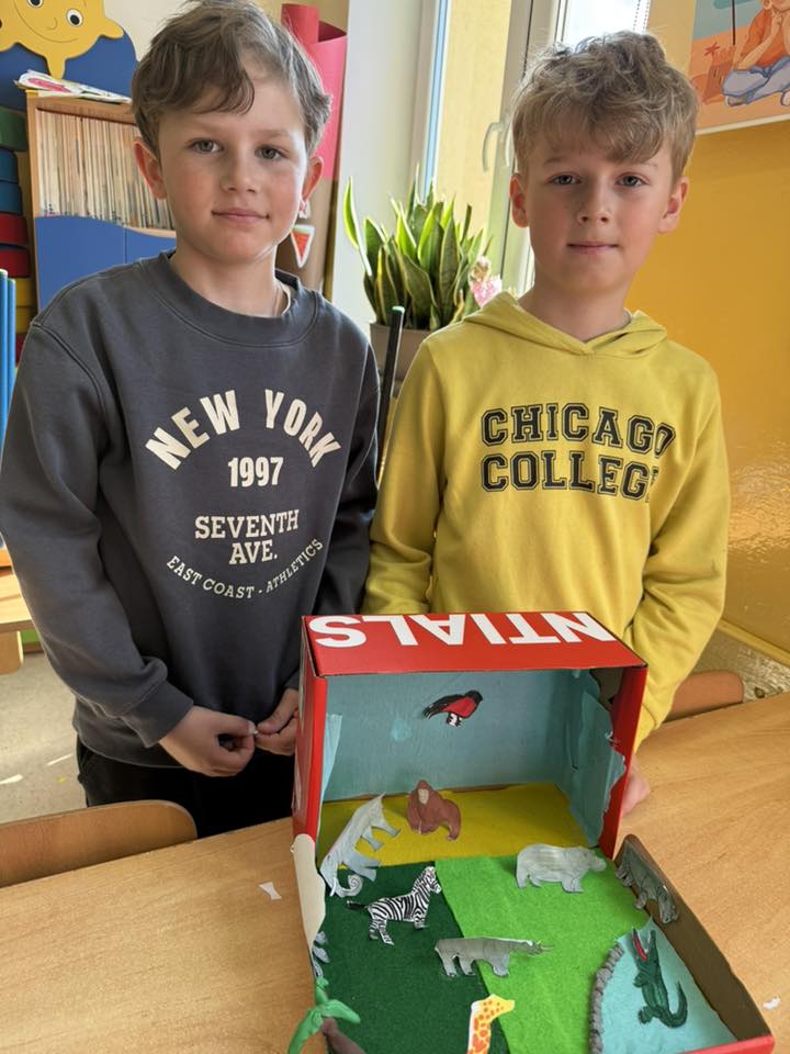 Uczniowie klasy III przygotowali projekt „Lektura w pudełku" na podstawie książki „Afryka Kazika". Uczniowie w parach stworzyli własne pudełko, w którym umieścili przedmioty związane z treścią lektury, takie jak zdjęcia zwierząt, rysunki bohaterów oraz symbole podróży Kazika. Dzieci wykazały się dużą kreatywnością i zaangażowaniem, starannie dobierając elementy oddające klimat książki.