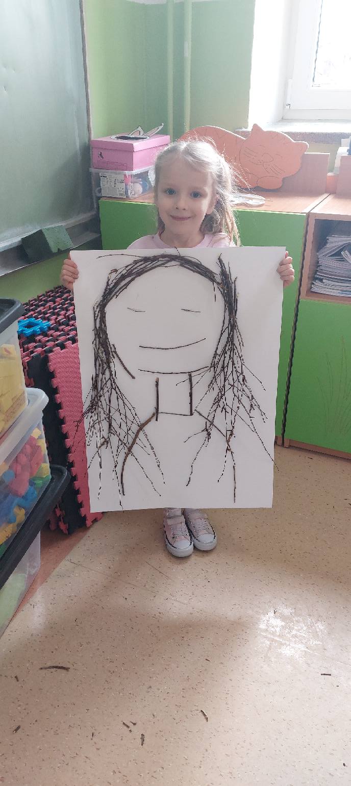 Następnie przyszedł czas na sztukę z natury – portrety z gałęzi. Patyki, kawałki kory zamieniały się w twarze o bardzo wyrazistych osobowościach. Dzieci ćwiczyły spostrzegawczość i kreatywność, a przy okazji przekonały się, że natura to najlepsza pracownia plastyczna.