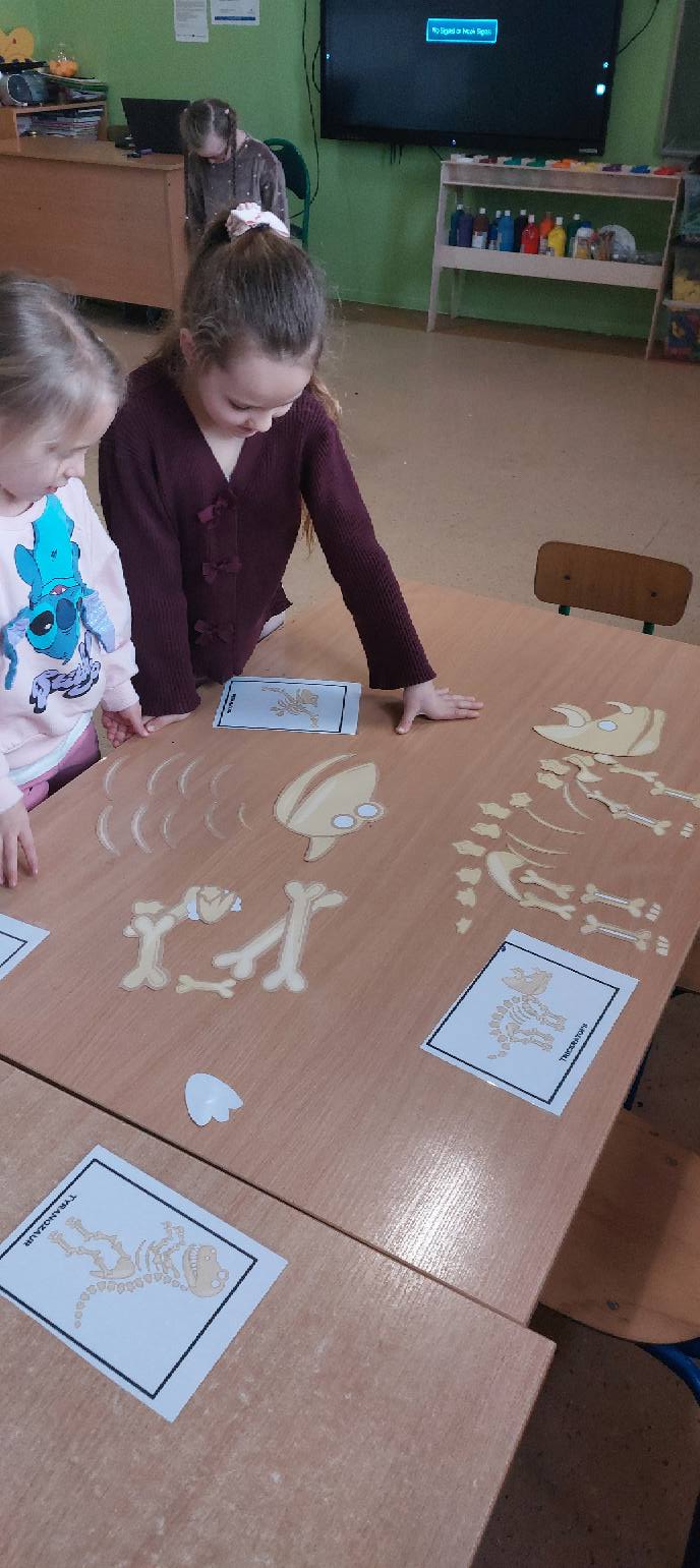 Wkroczyliśmy również w świat prehistorii. Dzieci składały z elementów szkieletów dinozaury, niczym mali paleontolodzy. Poznały podstawowe informacje o życiu w dawnych epokach, dowiedziały się, czym zajmuje się badacz skamieniałości i jak wyglądała Ziemia miliony lat temu. Składanie „kości" wymagało cierpliwości i współpracy – a gdy dinozaur w końcu stanął na „własnych nogach", satysfakcja była ogromna.