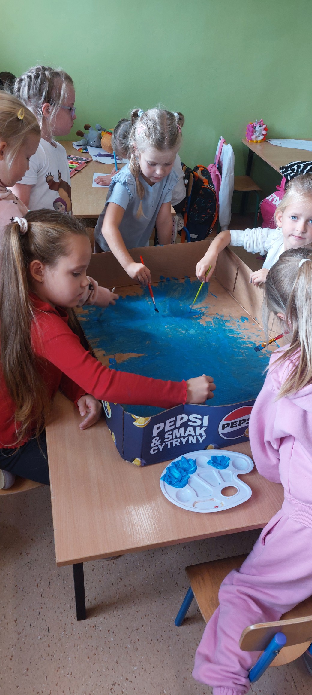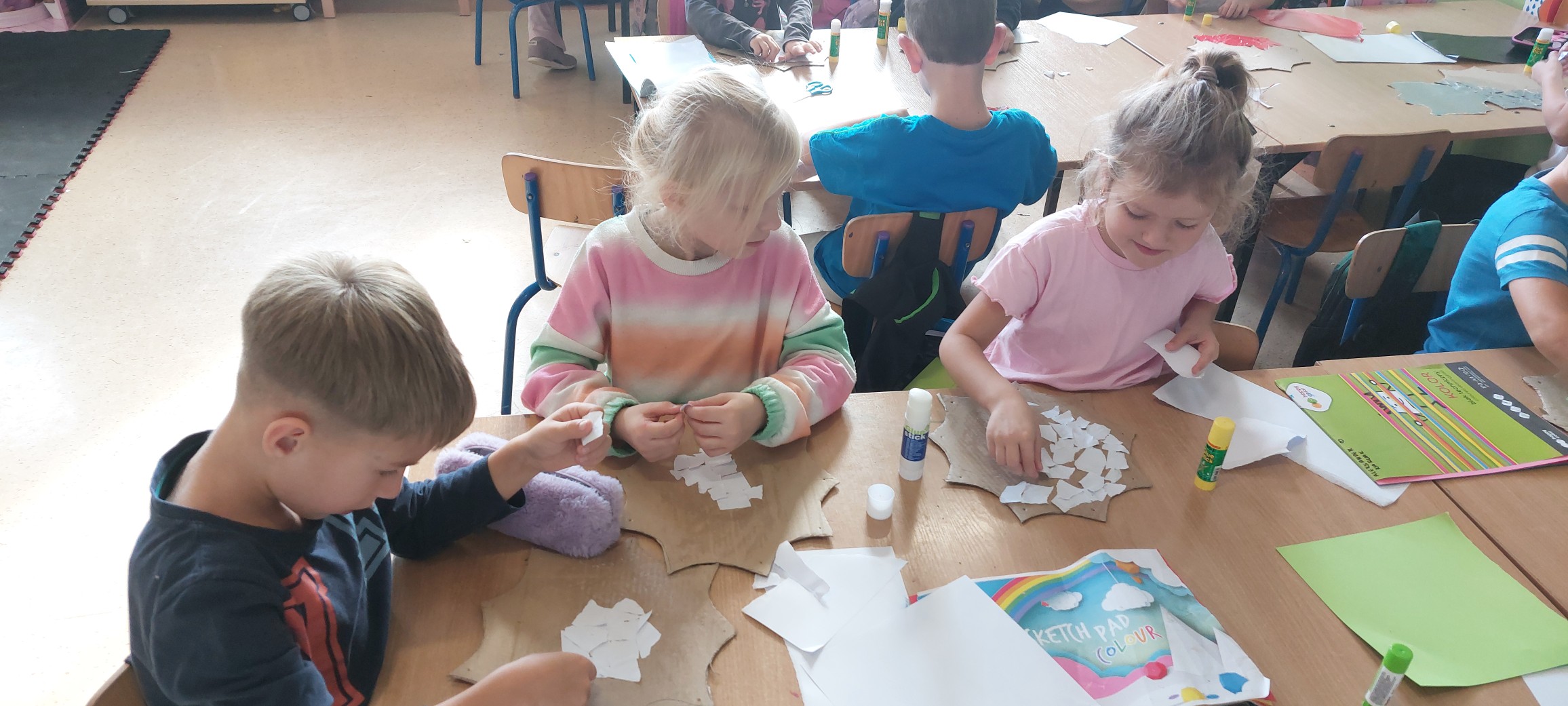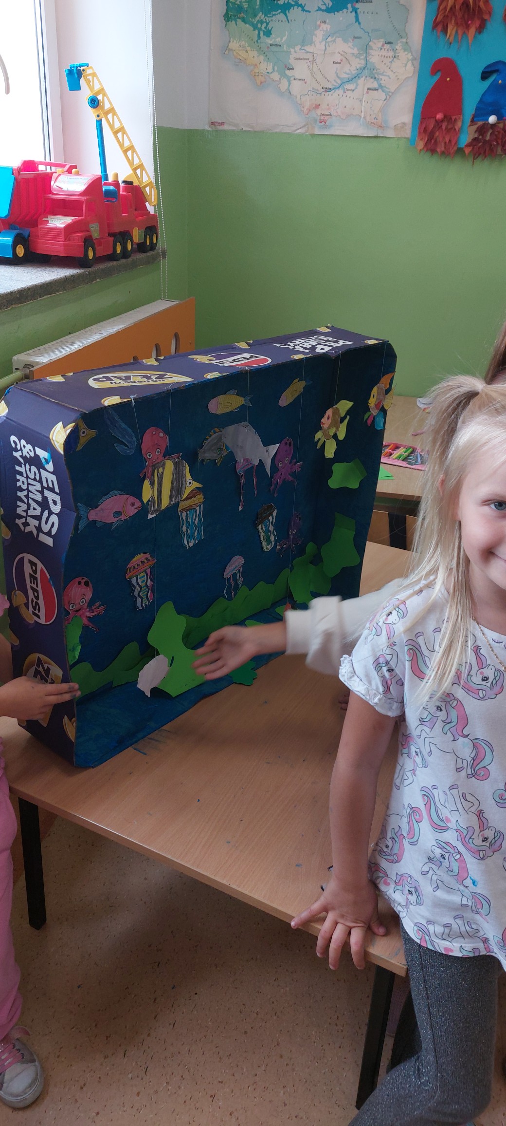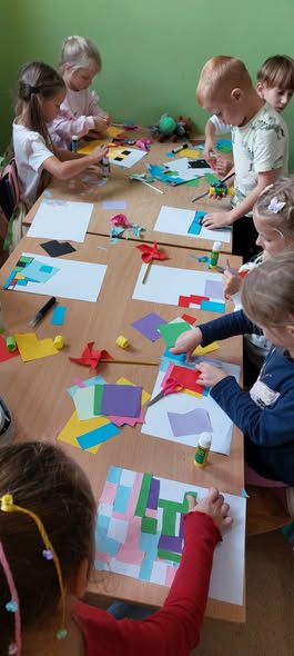 Podczas kolejnych spotkań przedszkolaki wspólnie wykonały duże akwarium – pełne rybek, glonów i bąbelków, wszystko powstało z papieru i materiałów plastycznych. Praca zespołowa okazała się świetną zabawą i pokazała, że razem można stworzyć coś naprawdę pięknego.