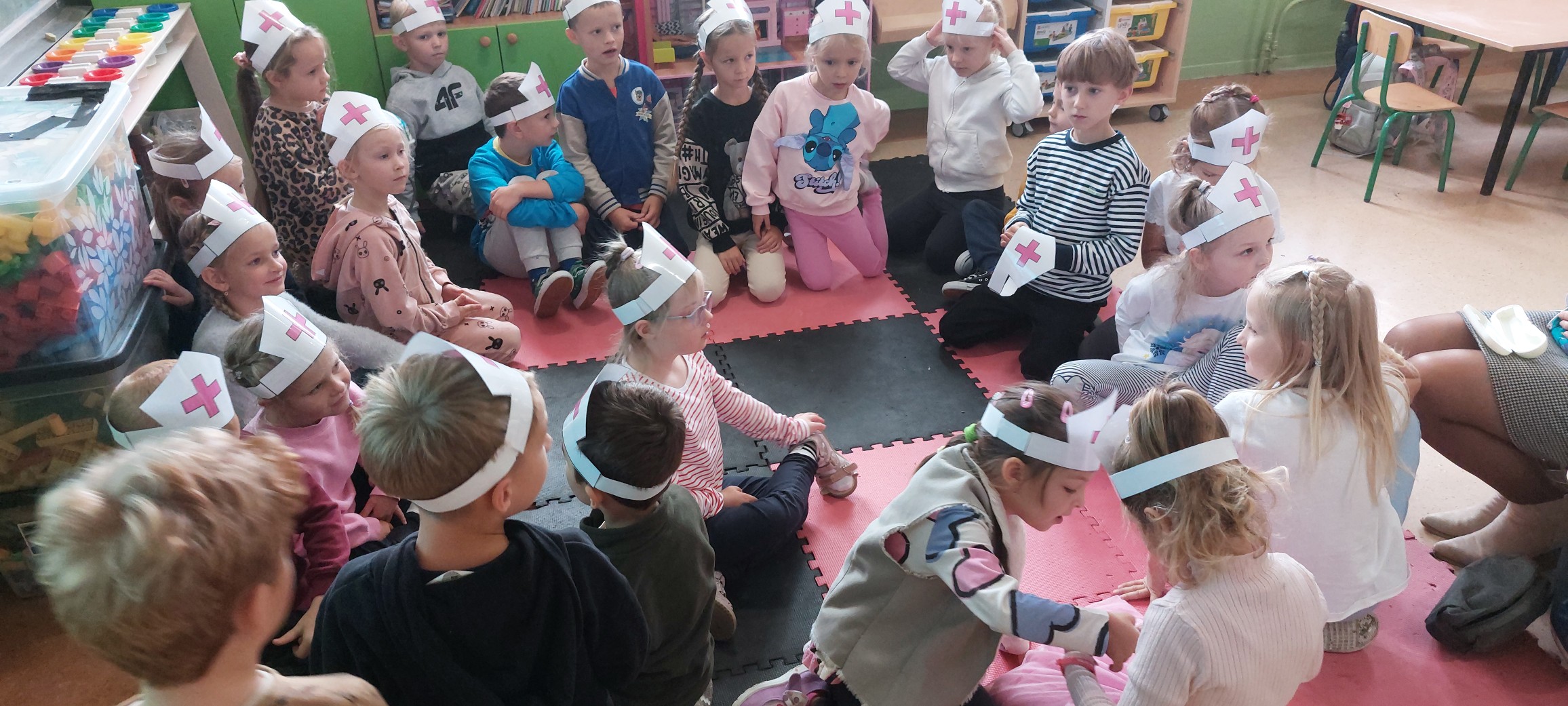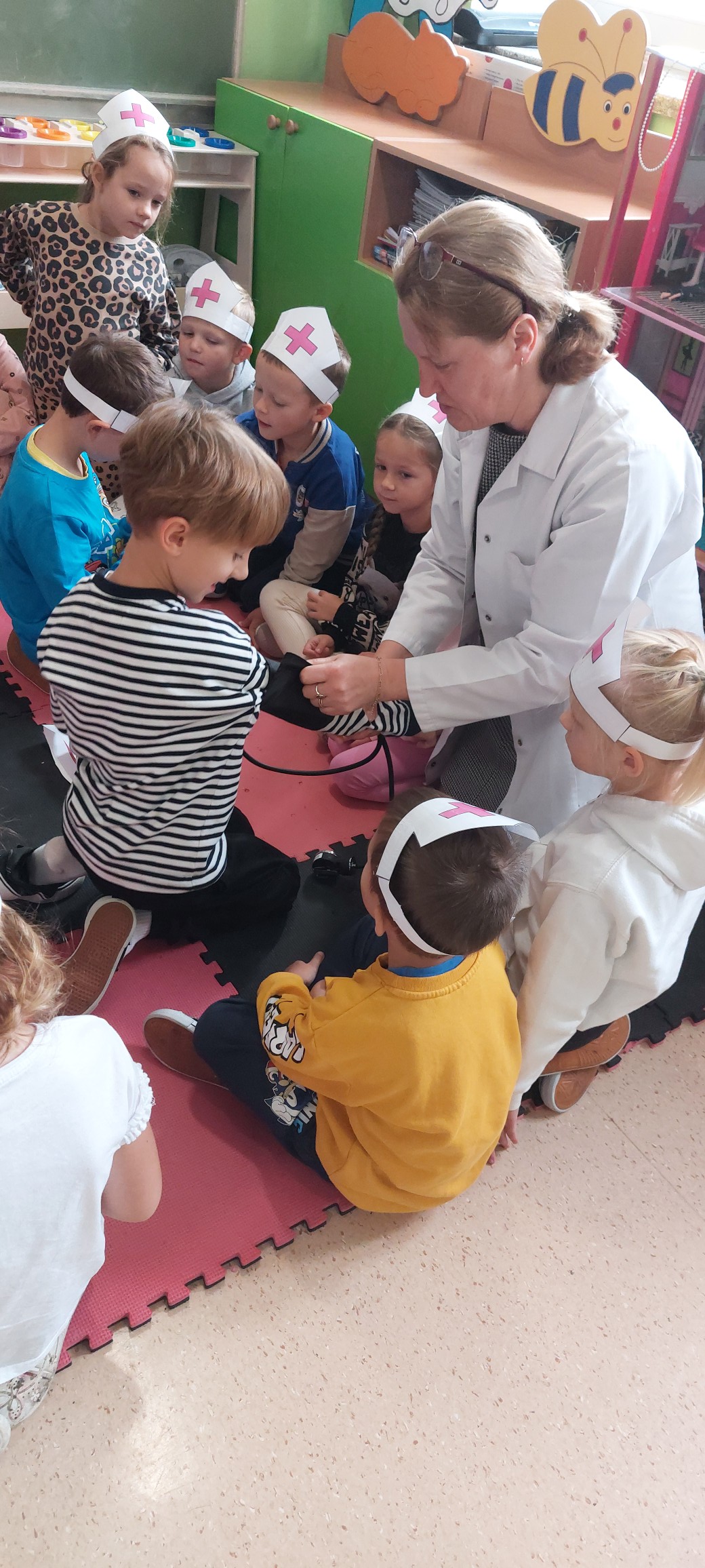 Dziś w naszym przedszkolu odbyło się bardzo ciekawe spotkanie z panią pielęgniarką. Dzieci dowiedziały się, na czym polega jej praca i jak ważna jest rola pielęgniarki w dbaniu o zdrowie ludzi. Przedszkolaki obejrzały krótki film edukacyjny, z którego mogły się dowiedzieć, w jaki sposób pielęgniarka pomaga chorym, jak udziela pierwszej pomocy i dlaczego tak ważne jest przestrzeganie zasad higieny.Po filmie pani pielęgniarka pokazała dzieciom swój sprzęt i pozwoliła im zobaczyć, jak mierzy się ciśnienie oraz temperaturę. Najodważniejsi mogli sami sprawdzić, jak działa ciśnieniomierz i termometr. Spotkanie wzbudziło duże zainteresowanie i wiele pytań – okazało się, że w grupie mamy nawet kilku przyszłych lekarzy i pielęgniarki!