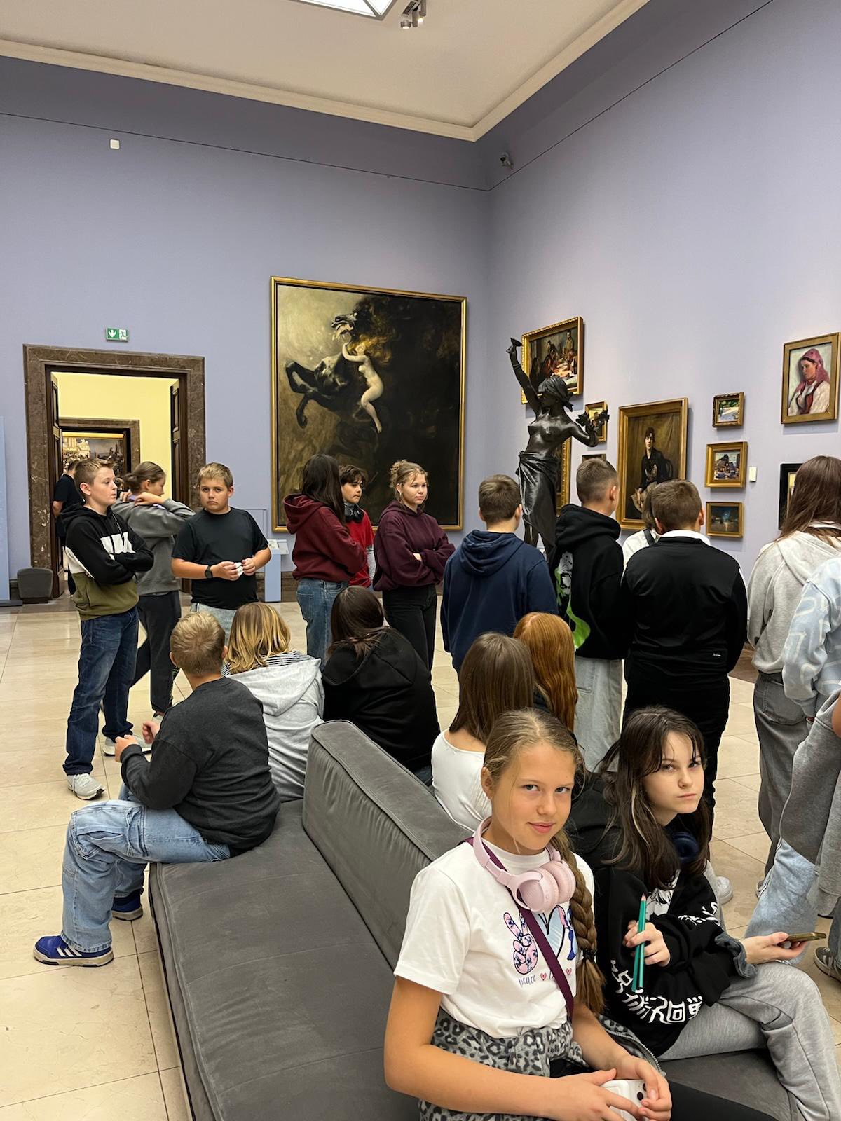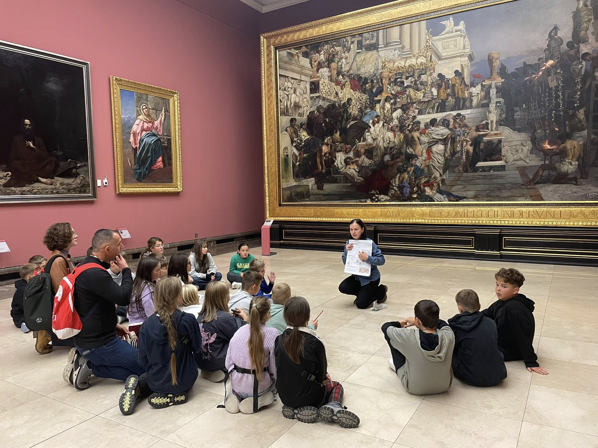 Uczniowie klas 4–8 mieli okazję uczestniczyć w niezwykłej wycieczce do Krakowa, która była połączeniem historii, sztuki i... odrobiny filmowej rozrywki! Nasze zwiedzanie rozpoczęliśmy od spotkania z przewodnikiem z grupy Aktywni w Muzeum Narodowym w Krakowie – Sukiennicach. Wzięliśmy udział w niestandardowej, aktywnej lekcji muzealnej w największej w Polsce, stałej ekspozycji dziewiętnastowiecznego malarstwa i rzeźby – Galerii w Sukiennicach.