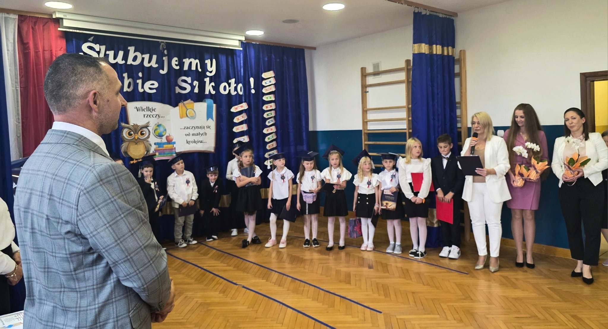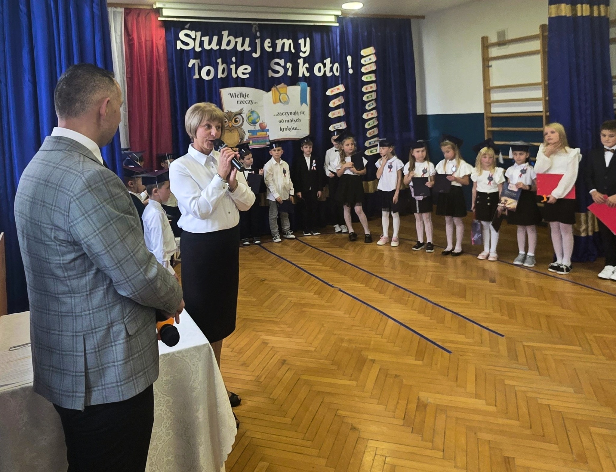 W dniu 24 października w naszej szkole odbyła się wyjątkowa i wzruszająca uroczystość – Ślubowanie uczniów klasy pierwszej! Z dumą patrzyliśmy, jak nasi najmłodsi uczniowie po raz pierwszy stanęli na szkolnej scenie, aby zaprezentować piękny program artystyczny. Dzieci recytowały wiersze, śpiewały piosenki i z uśmiechem opowiadały o tym, jak wspaniale jest być uczniem.