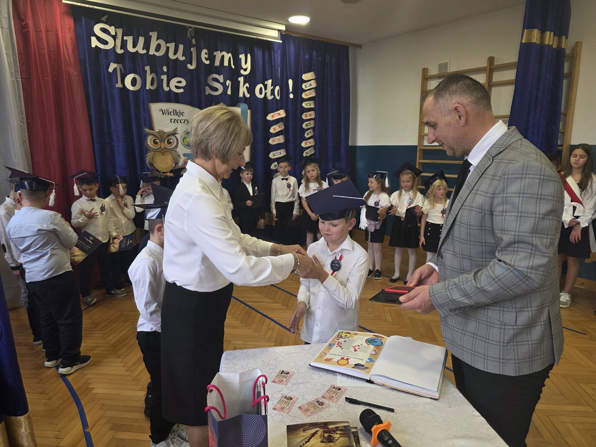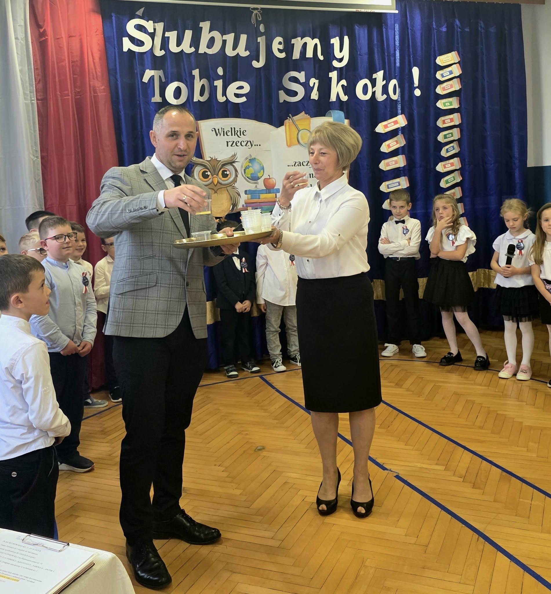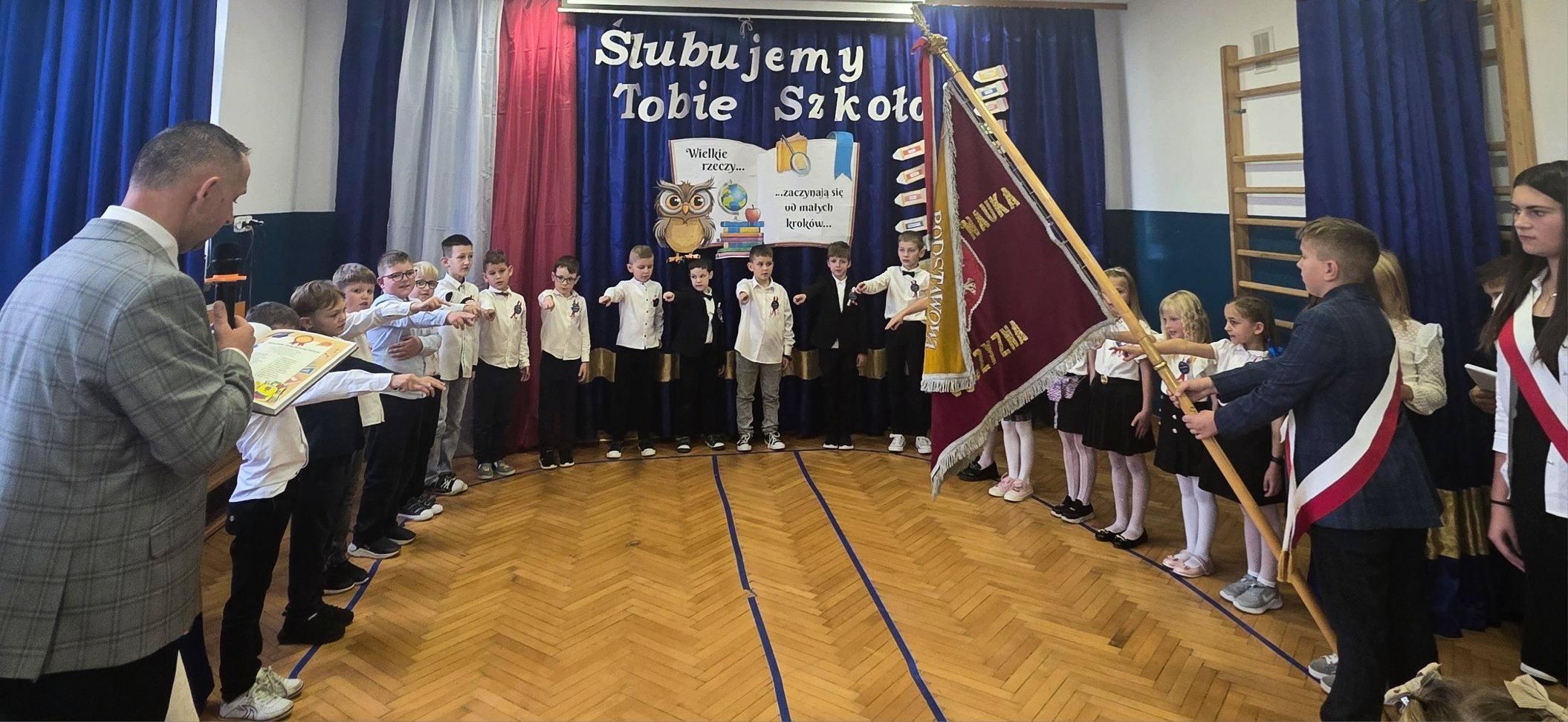 Najważniejszym momentem uroczystości było złożenie przez najmłodszych uczniów przysięgi uczniowskiej. W obecności Sztandaru Szkoły dzieci ślubowały sumiennie i systematycznie się uczyć, wzorowo zachowywać, być pilnym i uczciwym oraz dbać o dobre imię szkoły. Po przysiędze wszyscy pierwszoklasiści dostąpili zaszczytu pasowania na ucznia, dokonanego symbolicznym ołówkiem przez Pana Dyrektora Łukasza Klozyka- była to chwila pełna dumy i wzruszenia.