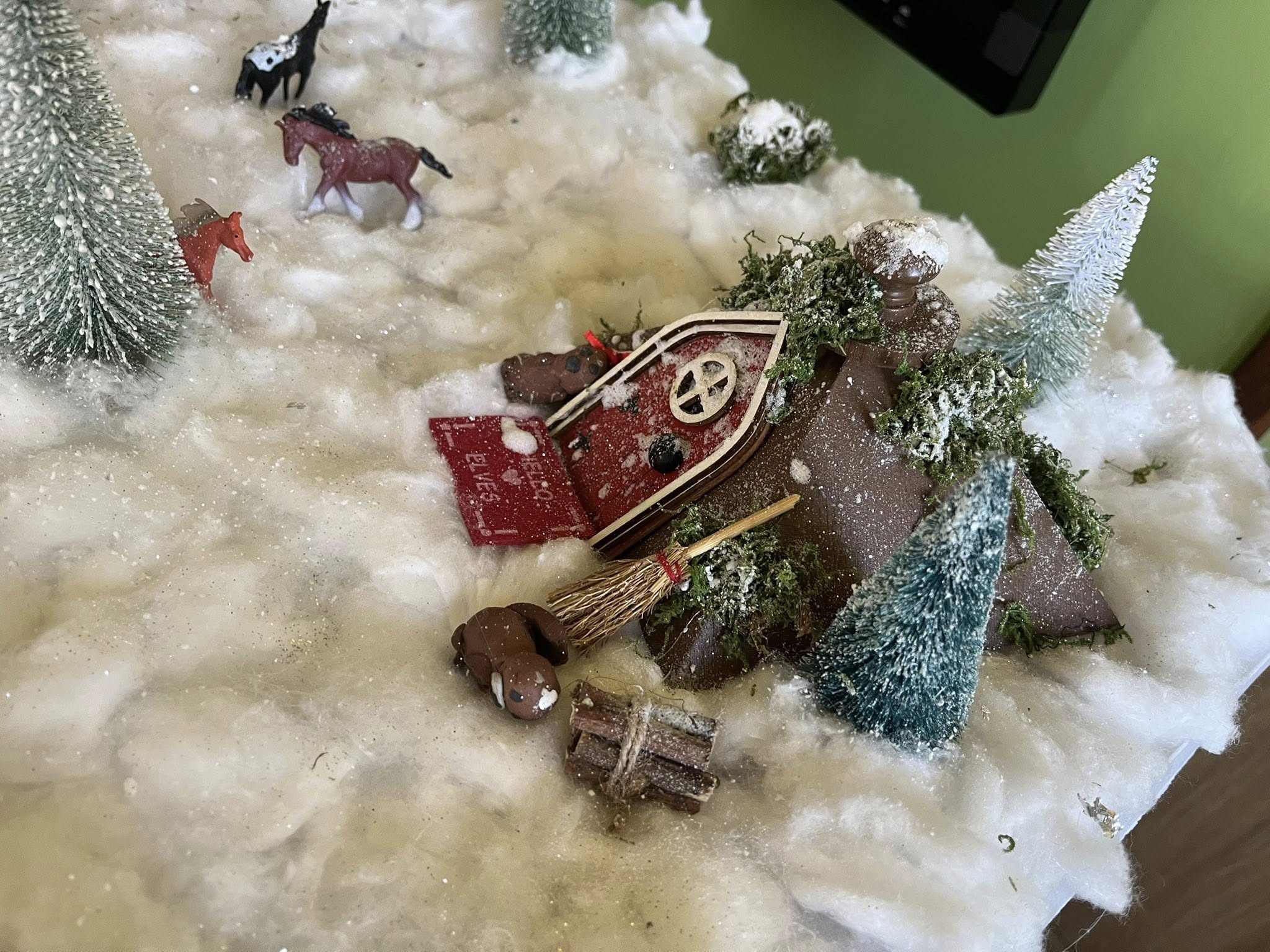 . Do pracy wykorzystali różnorodne materiały: karton, bibułę, masę papierową, białą watę, plastelinę, farby i elementy dekoracyjne.
