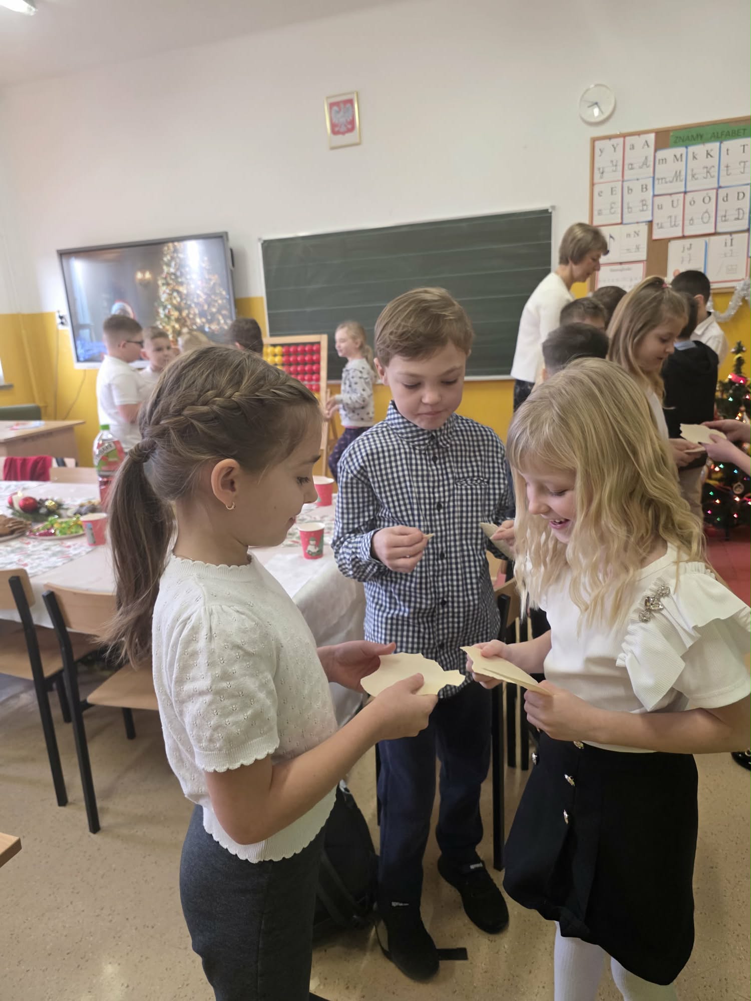 Wklasie pierwszej zrobiło się wyjątkowo twórczo i świątecznie! Uczniowie z ogromnym zapałem przygotowywali własnoręczne stroiki bożonarodzeniowe oraz piękne kartki świąteczne, pełne kolorów, brokatu i dziecięcej wyobraźni. Każda praca była niepowtarzalna i wykonana z wielkim sercem.Twórczym działaniom towarzyszył radosny, świąteczny nastrój, który dopełniła klasowa wigilia. Było wspólne łamanie się opłatkiem, serdeczne życzenia oraz degustacja tradycyjnego barszczyku z uszkami.