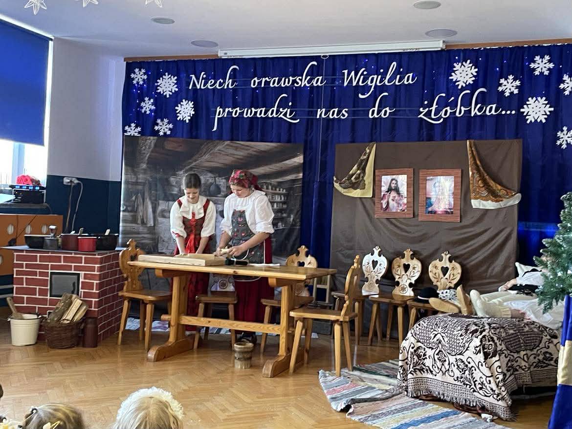 Następnie przenieśliśmy się do starej orawskiej chaty, gdzie szkolne kółko teatralne zaprezentowało inscenizację „Wilijo". Dzięki tej pięknej i autentycznej scenie mogliśmy poznać dawne zwyczaje i tradycje orawskie związane z obchodami Wigilii – pełne symboliki, rodzinnego ciepła i szacunku do tradycji przekazywanych z pokolenia na pokolenie.