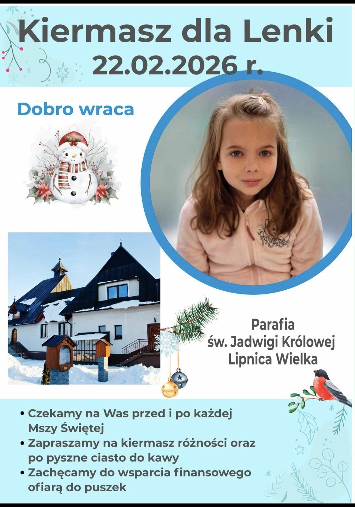 Już w najbliższą niedzielę, 22 lutego 2026 r., obok Kościoła w Murowanicy odbędzie się kiermasz charytatywny, z którego całkowity dochód zostanie przeznaczony na leczenie Lenki.